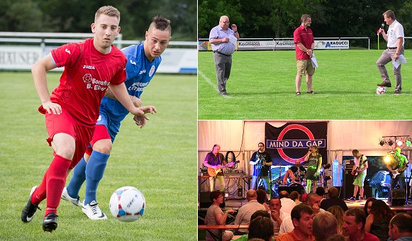 Turniere für Bambini sowie C-, D-, E- und F-Jugendmannschaften standen am Samstag auf dem Programm. Gegen Abend konnte der SV-Vorsitzende Ralf Bettinghausen Bürgermeister Peter Reichert und den Sportausschussvorsitzenden Dieter Jeitner auf dem Sportgelände begrüßen. Beide gratulierten dem Jubelverein und bedankten sich insbesondere für die wertvolle Jugendarbeit. Reichert spielte Bettinghausen symbolisch einen Fußball zu (unser Bild rechts oben). Es folgte ein Benefizspiel einer Neckartal-Auswahl gegen den VfR Mannheim (Oberliga). Die Gastgeber kassierten zwar in der ersten Hälfte gleich vier Tore, konnten aber nach der Pause den Mannheimern ganz gut Paroli bieten, so dass der Endstand mit 0:5 durchaus zu verschmerzen war (Bild links). Für Partyfans gab es am Samstagabend Live-Musik im Festzelt mit der Band "Mind da Gap" (Bild rechts unten). Am Freitagabend war eine Disco-Party unter dem Titel "YOBO Vol. 02" angesagt, und am Sonntagvormittag gastierte die Guggemusik "Agilastra Spiriti" aus Aglasterhausen zum bayerischen Frühschoppen.