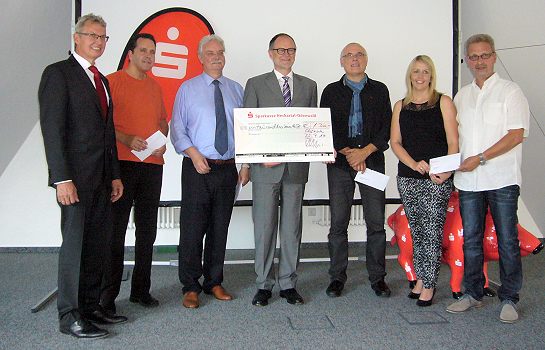 Überraschender Geldsegen für die Schulen der Region (Foto: privat)(bro) (bn) Die Sparkasse Neckartal-Odenwald präsentierte am 3. Mai in der Stadthalle Eberbach mit dem Landesjugendorchester Baden-Württemberg und Juri Tetzlaff vom KiKA bereits zum vierten Mal ein Familienkonzert als kulturelles Highlight für die Region. Die Erlöse aus dem Eintrittskartenverkauf wurden nun von Sparkassendirektor Helmut Augustin im Beisein von Regionaldirektor Karlheinz Emig dem Hohenstaufen-Gymnasium Eberbach, der Theodor-Frey-Schule Eberbach, Realschule Eberbach, Grundschule „Bildungswerkstatt“ Schönbrunn und Winterhauch-Grundschule Waldbrunn überreicht. Die Verantwortlichen der Schulen freuten und bedankten sich für diesen überraschenden Geldsegen in Höhe von insgesamt 1.300 Euro.