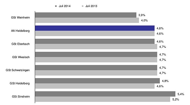 Sommerflaute auf dem Arbeitsmarkt Arbeitslosenquoten im Juli. (Grafik: Bundesagentur für Arbeit)(bro) (aa) Die Zahl der arbeitslosen Menschen im Heidelberger Agenturbezirk ist gegenüber Juni um 307 gestiegen. 16.519 waren zuletzt arbeitslos gemeldet. Die Arbeitslosenquote beträgt unverändert 4,6 Prozent, sie ist damit genau so hoch wie vor einem Jahr.