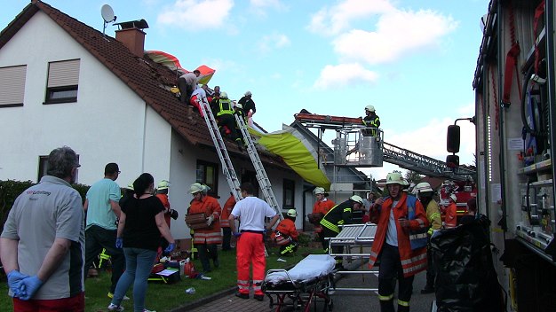 Schließlich schlug der Flieger kurz vor 17 Uhr in das Dach eines Einfamilienhauses im Schulacker ein. Durch das Notarztteam aus Eberbach und weitere Rettungskräfte musste der Pilot zunächst reanimiert werden. Nach weiteren medizinischen Stabilisierungsmaßnahmen wurde er per Rettungshubschrauber in eine Klinik nach Ludwigshafen geflogen. Über seinen Zustand ist noch nichts Näheres bekannt, aber es besteht wohl akute Lebensgefahr.
