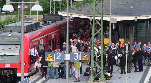 Mit der "Staatsbesuch"-Reihe lädt die S-Bahn Städte und Gemeinden der Region ein, sich kostenlos gegenseitig zu besuchen. Im März waren auf diese Weise 160 Gäste aus Speyer am Bärlauch-Eventwochenende in Eberbach (wir berichteten). Heute kamen rund 180 Eberbacher bei volkstümlicher Blasmusik auf dem Bahnsteig 2 zusammen, um kurz nach 9 Uhr mit der S-Bahn, die im Oktober 2009 auf den Namen „Eberbach am Neckar“ getauft worden war (wir berichteten), in die Pfalz zu starten.