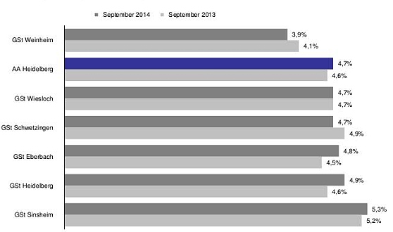 (bro) (aa) Die Zahl der arbeitslosen Menschen im Heidelberger Agenturbezirk ist von August auf September um 332 auf 16.720 Personen gesunken. Gegenüber dem Vorjahresmonat ist die Arbeitslosigkeit jetzt um 508 höher. Die Arbeitslosenquote beträgt 4,7 Prozent.
