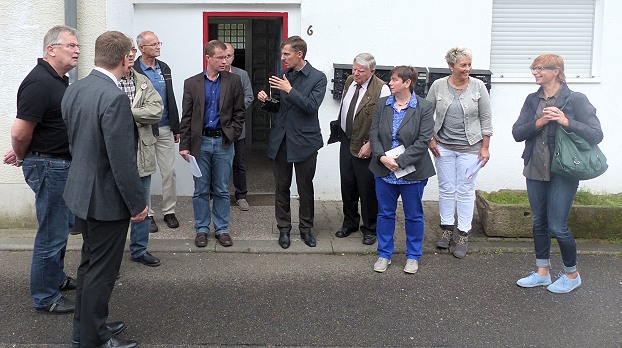 Humanitäre Verpflichtungen solidarisch tragen Lars Castellucci im Gespräch mit v.l.: SPD-Fraktionsvorsitzender Rolf Schieck, Bürgermeister Peter Reichert (mit dem Rücken zugewandt), Lindacher Anwohnern, Stefan Becker, Ordnungsamtsleiter LRA RN, Barbara Coors, Leiterin der VHS, Hauptamtsleiterin Anke Steck, Sozialarbeiterin Brigitte Keller. (Foto: privat)(bro) (sr) 1.300 Flüchtlinge finden im Rhein-Neckar-Kreis derzeit Zuflucht, etwa 260 von ihnen in Eberbach. Die Herausforderungen, vor denen Kommunen und BürgerInnen stehen, sind groß. „Ich will genau hinschauen und dann Lösungen finden - vor Ort und in Berlin“, so der SPD-Bundestagsabgeordnete Lars Castellucci bei seinem gestrigen Besuch in Eberbach.