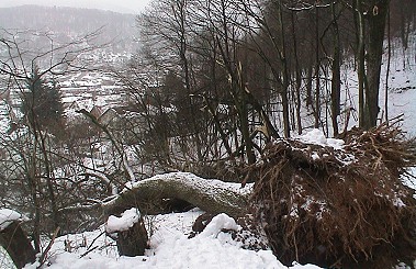 Nachwirkungen der Schneemassen beschäftigen auch die Stadtförsterei Auch alte Eichen gaben unter der Schneelast nach. (Foto:Richter)(hr) (stve) Auch im Eberbacher Stadtwald haben die Schneemassen um die Jahreswende für Durcheinander gesorgt. Auf ungefähr 1.500 Festmeter schätzt die Stadtförsterei die Menge des unter der Schneelast gebrochenen und umgefallenen Holzes. Dabei ging es quer durch alle Alters- und Stärkeklassen, angefangen bei Verjüngungsbeständen bis hinauf zu Althölzern. Der Schwerpunkt liegt jedoch in den 20- bis 50-jährigen Beständen.