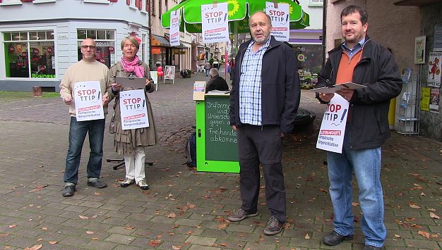 Mitglieder der AGL Eberbach und von Bündnis90/die Grünen informierten von 9 bis 14 Uhr vor der Michaelskirche die Passanten über Kritikpunkte an TTIP und hielten Unterschriftenblätter bereit mit der Aufforderung, die Verhandlungen über das Freihandelsabkommen zwischen EU und USA zu stoppen. Mit dabei war auch die grüne Landtagsabgeordnete Charlotte Schneidewind-Hartnagel.