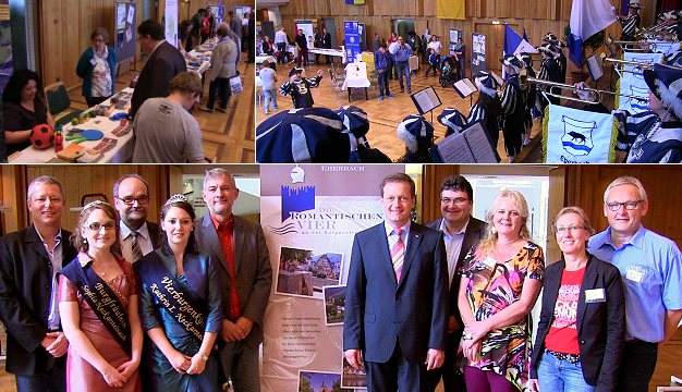 Zur Eröffnung begrüßte Eberbachs Bürgermeister Peter Reichert unter anderem seine Amtskollegen Rainer Sens (Hirschhorn), Herold Pfeifer (Neckarsteinach) und Horst Althoff (Neckargemünd). Mit dabei waren Mitarbeiter aus dem Tourismusbereich und touristische Repräsentanten der vier Städte, so z.B. der Eberbacher "Nachtwächter" Eugen Emmig oder die Vierburgenhoheiten Kathrin I. und Sophia aus Neckarsteinach. An den Infoständen gab es reichlich Prospektmaterial und kleine Geschenke zum Mitnehmen. Neben den "Romantischen Vier" waren heute in der Stadthalle auch die Partnerorganisationen TG Kurpfalz, TG Odenwald, der Geo-Naturpark Bergstraße-Odenwald und die Metropolregion Rhein-Neckar vertreten. Zur Eröffnung spielte der Eberbacher Fanfarenzug. Bei einem Gewinnspiel winkten den Besuchern Sachpreise, sofern sie die urkundlichen Ersterwähnungen der vier Städte richtig auf dem Teilnahmeschein vermerkten.