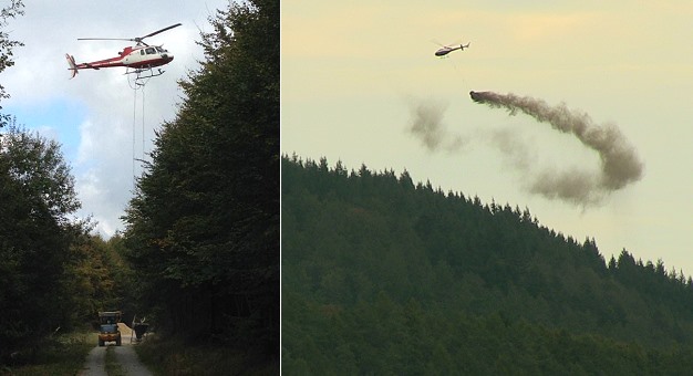 Erster Teil der Meliorationskalkung beendet (Fotos: StVE / Hubert Richter)(hr) (stve) Im Laufe der letzten Woche wurden im Bereich Hirschberg des Stadtwalds Eberbach Kalkungsmaßnahmen durchgeführt, wobei durch einen Hubschrauber 600 Tonnen Dolomitgesteinsmehl auf fast 200 ha Waldfläche ausgebracht wurden.