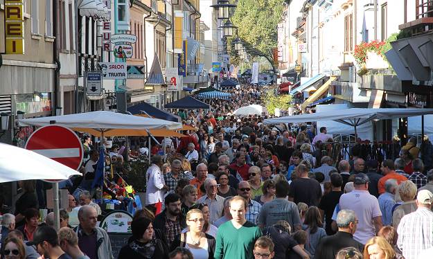 Markt und Kultur im frühherbstlichen Einklang So richtig voll wird es in der Eberbacher Bahnhofstraße eigentlich nur einmal im Jahr: am Apfeltag im Oktober. (Foto: Hubert Richter)Mehr Bilder (Klicken zum Vergrößern):