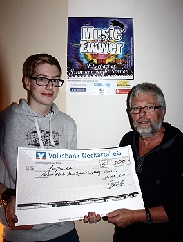 Mitakteur Simon Buchmüller freute sich, den Spendenbetrag von 500 Euro an Dieter Uhrig, stellvertr. Vorstand der Norbert Köhler Musikpreis-Stiftung, übergeben zu dürfen. Dieter Uhrig bedankte sich im Namen der Stiftung: „Wir freuen uns, dass die Spende von „Music for Ewwer“ dazu beiträgt, unseren musikalischen Nachwuchs - ganz im Sinne der Norbert Köhler Musikpreis-Stiftung - zu fördern. Vielen Dank.“
