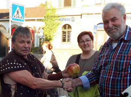 Bogensportler krönen Apfelkönig Der 1. Vorsitzende Peter Schäffler überreichte einen präparierten Apfel an den Gewinner des Tages, Adolf Helm aus Rothenberg. (Foto: privat)(bro) (ub) Am Apfeltag hatte der Bogensportverein Eberbach (BSV) wieder sein Zelt am Bahnhofsplatz aufgestellt. Viele nutzten die Möglichkeit, mit dem Bogen Pfeile auf eine „Apfelscheibe“ zu schießen.