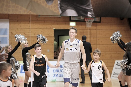 20 Kinder durften mit Bundesligisten einlaufen (Foto: Gäde Fotodesign)(bro) (sh) Einen aufregenden Auftakt ihrer Spielsaison erlebten die jüngsten Basketballer des TV Eberbach am 26. Oktober. Auf Einladung des USC Heidelberg durften 20 Mädchen und Jungen der letzten Basketball-Ferienspaßaktion des TVE und des Rotary Clubs Eberbach und der U12-Mannschaft des TVE mit den Spielern der Zweitliga-Basketballmannschaft vor großem Publikum in die Halle des Olympiastützpunktes Heidelberg einlaufen. Den Kontakt zu den Verantwortlichen des USC Heidelberg hatte Dr. Schmitt vom Rotary Club Eberbach hergestellt.