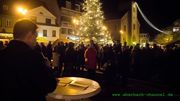 Von Freitagnachmittag bis Sonntagabend, 1. Advent, herrschte auf dem Neuen Markt vorweihnachtliche Stimmung. Aus rund 15 Buden bestand das Weihnachtsdorf, und neben Kunsthandwerk und kulinarischen Angeboten kam auch wieder die Unterhaltung nicht zu kurz. Vor dem beleuchteten Weihnachtsbaum in der Mitte des Platzes war eine Bühne aufgebaut, auf der verschiedene Kulturevents stattfanden. Es musizierten der evangelische Posaunenchor, der Fanfarenzug, die Riverside Gospel Singers, der Chor "Right Now!", Kinderchöre der Eberbacher Grundschulen und der russische Chor "Nadeshda". Am Samstagnachmittag kam das Christkind (Lilith Back) mit einem Schlittenhundegespann auf den Weihnachtsmarkt gefahren, und der Weihnachtsmann (Eugen Emmig) verteilte kleine Geschenke. Bürgermeister Peter Reichert hatte den Weihnachtsmarkt am Freitagabend mit einer kleinen Ansprache eröffnet.