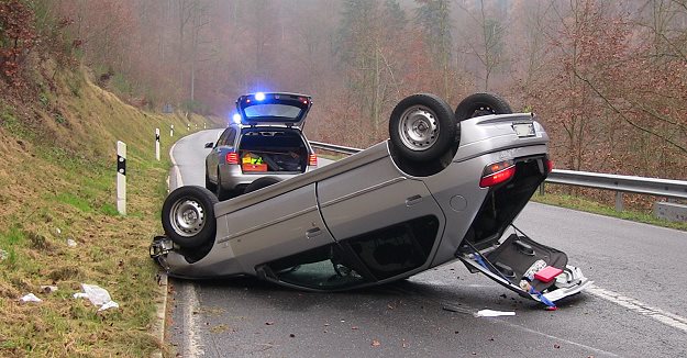 In Linkskurve ins Schleudern geraten (Foto: Hubert Richter)(hr) Nach einer Schleuderpartie auf dem Dach landete heute am frühen Nachmittag ein Pkw auf der L 524.