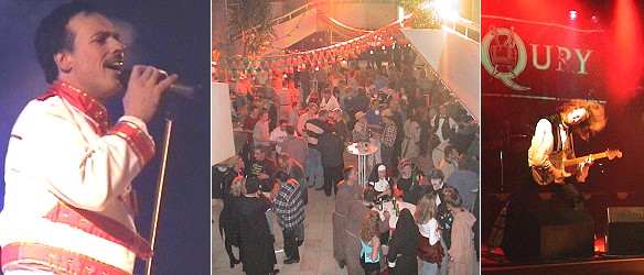 Freddie Mercury ist unsterblich (Fotos:Richter)(hr) Ein außergewöhnliches Rosenmontags-Event lockte gestern abend knapp 700 Besucher in die Eberbacher Stadthalle. Veranstalter Benny Safferling hatte mit "Merqury" eine der besten Queen-Cover-Bands nach Eberbach geholt. Frontmann Johnny Zatylny (linkes Bild), ein gebürtiger Kanadier, kam seinem 1991 verstorbenen Vorbild Freddie Mercury sowohl optisch als auch stimmlich teils frappierend nahe. Die Band aus Dresden zog das Publikum von Anfang an in ihren Bann, und so wurden bereits nach wenigen Minuten die Songtexte lauthals mitgesungen. Zwischendurch legten die DJs Heiko und Mathias (Ex-TVE-Oldie-Party) Rock- und Popklassiker auf und sorgten für Party-Stimmung bis in den frühen Morgen.