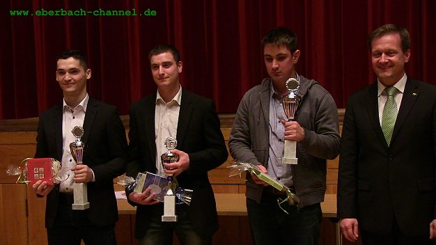 Medaillenregen in der Stadthalle V.l. die Sportler des Jahres: Wladislaw Gumarow (1., Karate), Lukas Friedrich (2., Motorsport), Sebastian Adolph (3., Skilanglauf), mit Bürgermeister Peter Reichert. (Foto: Hubert Richter)Mehr Bilder (Klicken zum Vergrößern):