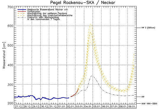 Hirschhorn ergreift vorbeugende Maßnahmen – In Eberbach ist der Neckarlauer gefährdet (Quelle HVZ BW)(tom) Am Neckar kündigt sich das erste Hochwasser des neuen Jahres an: Die aktuellen Vorhersagen prognostizieren wegen Schneeschmelze und Regen für Sonntag ein Überfluten der Uferstraße in Hirschhorn und des Neckarlauers in Eberbach.