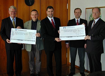 Musikschule und Schlossfestspiele profitieren von Volksbank-Konzert V.l. Volksbank-Vorstandsmitglied Wilfried Herbold, Tobias Soldner, Detlef Piepenburg, Volksbank-Vorstandsmitglied Ekkehard Saueressig und Vorstandsvorsitzender Herbert Hinterschitt. (Foto:Peters)(hr) (Quelle:Eberb.Ztg.) Ein erfreulicher Anlass führte heute Landrat Detlef Piepenburg (Neckar-Odenwald-Kreis) und Musikschulleiter Tobias Soldner zur Volksbank Neckartal in Eberbach. Das Geldinstitut überreichte den Erlös aus seinem Neujahrskonzert "Euro nach Noten" - aufgestockt 3.000 Euro - zu gleichen Teilen an die Musikschule Eberbach und die Schlossfestspiele Zwingenberg. Vorstandsvorsitzender Herbert Hinterschitt kündigte an, dass das von seinem Haus unlängst vorgestellte Konzept "Schulsponsoring" in Kürze auch Anwendung auf den Bereich Vereine finden soll.