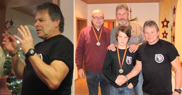Ein gemütlicher Kegelabend mit Ehrung der Kreismeister Links: Peter Schäffler bei seiner Ansprache. Rechts die Kreismeister v.l.: Manfred Müller, Axel Leippe, Felix Deininger. (Fotos: privat)(bro) (balo) Am Samstag vor Weihnachten trafen sich die Mitglieder des Bogensportvereins Eberbach (BSV) im Keglerheim zu ihrer Winterfeier.