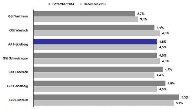 Leichter Anstieg der Arbeitslosigkeit - Quote unverändert bei 4,5 Prozent Arbeitslosenquoten im Dezember. (Grafik: Bundesagentur für Arbeit)(bro) (aa) Die Zahl der arbeitslosen Menschen im Heidelberger Agenturbezirk ist von November auf Dezember um 163 auf 16.104 Personen angestiegen. Gegenüber dem Vorjahresmonat ist die Arbeitslosigkeit jetzt um 458 höher. Die Arbeitslosenquote beträgt unverändert 4,5 Prozent.