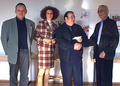 Lions Club überreichte Erlös der Weihnachtsaktion V.l. Tobias Soldner (Vizepräsident Lions Club), Ina Elsner, Friedbert Dörfler und Hugo Hessel (Foto:A.Claussen)(jc) (ac) Am heutigen Donnerstag fand in den Räumen der Musikschule Eberbach eine Spendenübergabe des Lions Club an die Eberbacher Kindergärten statt. Friedbert Dörfler, Präsident des Lions Club, überreichte an die Vertreter der evangelischen und katholischen Kindergärten Ina Elsner und Hugo Hessel einen Scheck in Höhe von je 600 Euro für alle sechs Eberbacher Kindergärten. Diese unterstützten die Christbaumaktion am Weihnachtsmarkt mit Ihren Bastelarbeiten, Baumschmücken sowie Weihnachtsliedersingen. Dörfler betonte, auch künftig Aktionen zugunsten der Kinder und Jugendlichen in Eberbach fördern zu wollen.