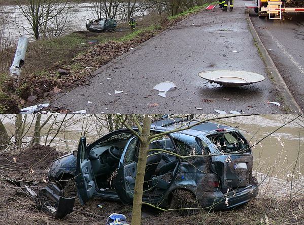 Der 39-jährige Fahrer eines Renault war in Richtung Rockenau unterwegs und kam auf nahezu gerader Fahrbahn plötzlich nach links von der Straße ab. Der Wagen mähte eine Straßenlaterne um, stürzte die steile Böschung hinab und überschlug sich mehrmals über Front und Heck, bevor er am Neckarufer auf den Rädern zum Stehen kam. Der Fahrer konnte sich selbst aus dem Wrack befreien. Er hatte großes Glück, dass der Wagen nicht in den Fluss gestürzt war, sondern unmittelbar davor, im noch vom letzten Hochwasser aufgeweichten Uferbereich liegen blieb. Der Mann wurde durch das Eberbacher Notarztteam versorgt und vom DRK in ein Krankenhaus eingeliefert.