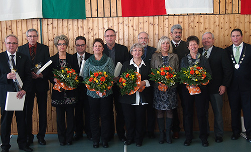 Die Entwicklung der Gemeinde mitbestimmt Die geehrten Kommunalpolitiker mit Ehefrauen und Bürgermeister Markus Haas. (Foto: Hofherr)(hof) Zur Tradition gehört es, beim Neujahrsempfang der Gemeinde Waldbrunn diverse Ehrungen zu überreichen. Darunter auch Ehrungen des Gemeindetags an langjährige Kommunalpolitiker. Dieser Aufgabe kam Bürgermeister Markus Haas am Dreikönigstag in der Winterhauch-Halle gerne nach.