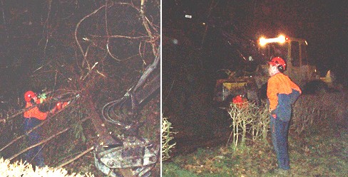 Bäume blockierten Weg nach Krösselbach (Fotos:privat)(hr) Unangenehme Nachwirkungen der Schneemassen um die Jahreswende zeigten sich gestern nachmittag zwischen Rockenau und Krösselbach. Eine vom Schnee bereits schräg gedrückte Fichte im Privatwald fiel auf den Verbindungsweg am Neckarufer, vermutlich weil der Boden nach den massiven Regenfällen ihr keinen Halt mehr bot. Die Wasserschutzpolizei inspizierte die Lage, stellte noch weitere gefährlich hängende Bäume fest und schaltete das städtische Ordnungsamt ein. Dieses rief dann die Freiwillige Feuerwehr auf den Plan, um die Gefahren schnellstmöglich zu beseitigen. Die Floriansjünger stellten vorort allerdings fest, dass die anstehenden Arbeiten die technischen Möglichkeiten der Feuerwehr überstiegen. Gegen 17 Uhr schließlich wurden Fachleute aus dem städtischen Forst um Hilfe gebeten. Ein Team der Stadtförsterei mit zwei Forstwirten und der städtischen Spezial-Rückemaschine begann kurz darauf mit den Aufräumarbeiten, die sich aufgrund der Menge und der gefährlichen Spannungen im Holz der gebogenen Bäume bis in die Dunkelheit hinzogen. Schließlich war aber die Strecke nach Krösselbach wieder frei und gefahrlos passierbar. Unsere Bilder zeigen die Mitarbeiter der Stadtförsterei bei den gefährlichen Arbeiten.
