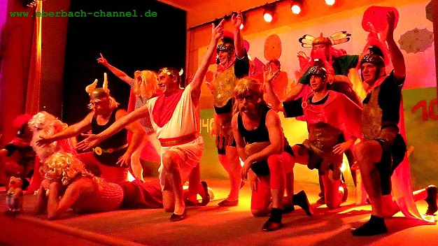 Nach dem Auftritt der Symbolfigur “Till” (Angela Frömming) versetzte der jüngste Tanznachwuchs, die “Eulenküken”, das Publikum nach Ägypten in die Zeit der Pharaonen. Carola Zimmermann und Diana Rieger verglichen humoristisch das moderne Leben heute mit den 1960er Jahren, bevor die “Eulenfunken” einen ersten Marschtanz präsentierten. Eine Lektion “Bayerisch für Einsteiger” gab es mit Johann Bachl, Bennis Nussbeutel, Steffen Bock und Angela Frömming. Tanzmariechen Manuela Vay riss das Publikum zu Beifallsstürmen hin, und Willi Rebscher, der von Bürgermeister Peter Reichert in der Sitzung mit dem Orden “Lachender Eber” der Stadt dekoriert wurde, stand wieder als Stadtführer in der Bütt. Ein echter Knaller vor der Pause war der Gesangscontest zwischen Andrea Berg (Nadja Krawczyk) und Helene Fischer (Tina Kämmler), das schließlich Conchita Wurst (Roman Krawczyk) für sich entschied. Und der zu dieser Nummer einführende Monolog von Barbara Krawczyk als Putzfrau wäre fast einen eigenen Programmpunkt wert gewesen.