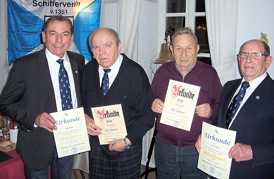 Schifferverein Eberbach 1351 ehrt seine langjährigen Mitglieder Von li.: Willi Müßig, Frieder Müßig, Ludwig Landi und Georg Leutz. (Foto: privat)(bro) (schv) Mit den Glockenschlägen „In Gottes Namen“ eröffnete das älteste Vereinsmitglied des Schiffervereins Eberbach, Karl Kinzler (91), kürzlich den Jahrtag 2015.