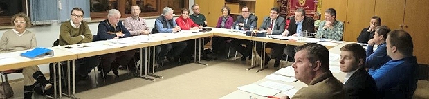 kommunalen Finanzausgleich referierte Ministerialrat Patrik Kraulich (hinten Mitte) vom hessischen Finanzministerium. (Foto: Thomas Wilken)(tom) „Da steh ich nun, ich armer Tor! Und bin so klug als wie zuvor.“ An Goethes Faust dürften sich kürzlich einige Stadtverordnete nach dem Vortrag über die Neufassung des kommunalen Finanzausgleichs (KFA) 2016 erinnert gefühlt haben. Das lag weniger am eloquenten Referenten selbst, Leitendem Ministerialrat Patrik Kraulich aus dem hessischen Finanzministerium, sondern an der Komplexität und schieren Masse des Zahlenwerks. Das besteht aus 180 Seiten, wie sie der hessische Finanzminister gerade in den Landtag einbrachte. Und zusätzlich 22.000 Seiten Daten der Städte und Gemeinden. Etwas „für ein paar stille Stunden“, wie Kraulich ironisch anmerkte.