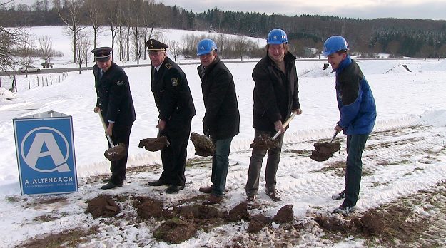 Historischer Moment im Enzhaag V.l. Feuerwehrkommandant Udo Dentz, Kreisbrandmeister Peter Michels, Bürgermeister Jan Frey, Architekt Volker Sternemann und Oliver Gailfuss vom Bauunternehmen Altenbach. (Foto: Hubert Richter)(hr) Das größte Bauprojekt in Schönbrunn steht in den Startlöchern: Mit dem heutigen “ersten Spatenstich” beginnt der Neubau des zentralen Feuerwehrstandorts im Enzhaag.