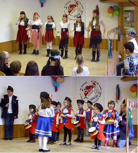 Marienkäfer Jasmina Ihrig und Minni Maus Laura Friedrich konnten viele verkleidete Kinder und Erwachsene begrüßen. Mit Polonaise, Tanzspielen und den beliebten Bonbonwürfen wurde dieser Nachmittag wieder zu einer kurzweiligen Veranstaltung. Auch die Aufführungen des Kindergartens „Wirbelwind“ (als Schöllenbacher Spielmannszug) und der Piratentanz (von Celine Grabe und Melissa Laqua einstudiert) gefiel allen sehr.