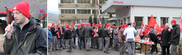 Horst Raupp, Regionssekretär des DGB Südhessen, Holger Hammer-Huhn, zweiter Bevollmächtigter der IG Metall Darmstadt, und der Betriebsratsvorsitzende Gernot Walter thematisierten beim halbstündigen Ausstand vor dem Firmengelände das ihrer Ansicht nach „unzureichende Angebot der Arbeitgeberseite“ in der laufenden Tarifrunde. Besonders „das mangelhafte Angebot zur Altersteilzeit“ wurde angesprochen. Gerade für einen Standort wie Hirschhorn sei es besonders wichtig, der demografischen Entwicklung im Betrieb mit Regelungen zur Altersteilzeit in Verbindung mit einem tariflichen Anspruch auf Bildungsteilzeit entgegen zu wirken, so Hammer-Huhn.