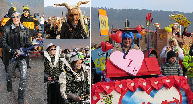 Zugmarschall Richard Rucktäschel und “Generalfeldmarschall” Matthias Denner haben den Umzug mit zehn Musikkapellen aus Waibstadt, Heilbronn, Meimsheim, Oberschönmattenwag, Wiesenbach, Aglasterhausen, Waghäusel, Heidelberg, Eberbach und Hirschhorn gespickt. Die am Umzug teilnehmenden Gruppen kamen unter anderem von den Hirschhorner Rittern und dem HCV Lachsbachperle, von der KG Kuckuck und dem Club Eulenspiegel nebst weiteren Zugnummern aus Eberbach und Ortsteilen, außerdem aus Waldbrunn, Rothenberg, Schönau, Neckarsteinach, Beerfelden, Hainbrunn, Mückenloch, Wiesenbach, Heddesbach und sogar Rastatt. Sehr aufwändige Motivwagen präsentierten auch in diesem Jahr wieder die “Wilden aus dem Ittertal” und die Karnevalfreunde Haidebow.