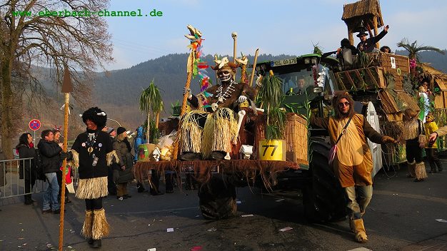 Zugmarschall Richard Rucktäschel und “Generalfeldmarschall” Matthias Denner haben den Umzug mit zehn Musikkapellen aus Waibstadt, Heilbronn, Meimsheim, Oberschönmattenwag, Wiesenbach, Aglasterhausen, Waghäusel, Heidelberg, Eberbach und Hirschhorn gespickt. Die am Umzug teilnehmenden Gruppen kamen unter anderem von den Hirschhorner Rittern und dem HCV Lachsbachperle, von der KG Kuckuck und dem Club Eulenspiegel nebst weiteren Zugnummern aus Eberbach und Ortsteilen, außerdem aus Waldbrunn, Rothenberg, Schönau, Neckarsteinach, Beerfelden, Hainbrunn, Mückenloch, Wiesenbach, Heddesbach und sogar Rastatt. Sehr aufwändige Motivwagen präsentierten auch in diesem Jahr wieder die “Wilden aus dem Ittertal” und die Karnevalfreunde Haidebow.