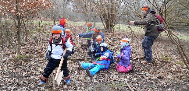 Der Stamm der Hirschhorner Waki Indianer auf Spurensuche (Foto: privat)(bro) (mo) Im Wald über Hirschhorn war kürzlich der Bär los. Dort erreichte den Waldkindergarten des Postillion e.V. eine Mitteilung, dass sich ein Bär im Wald versteckt hält. Deshalb beschlossen die "Waki Indianer", ihn zu suchen. Sie legten ihre Kriegsbemalung auf, machten sich Mut durch Indianergesänge, und dann ging es auf leisen Sohlen los, den Bären zu suchen.