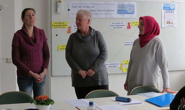 Großes Interesse an jungem Verein Natalie Hempel, Ruth Leifeld und Keriman Bozkurt (v.l.) begrüßten die anwesenden Frauen. (Foto: Claudia Richter)(cr) Frauen des Stadtteiltreffs "Frauencafé" treffen sich regelmäßig in der Unteren Talstraße zum Austausch oder zu Informationsveranstaltungen. Heute wurde der Verein Tauschbörse Eberbach auf Einladung von Frauencafé-Mitorganisatorinnen Natalie Hempel und Keriman Bozkurt vorgestellt.