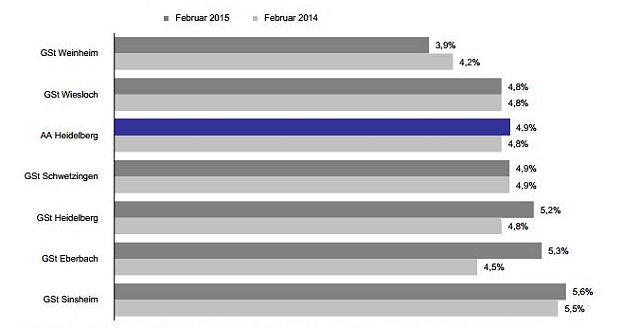 Leichter Rückgang der Arbeitslosigkeit Arbeitslosenquoten im Februar. (Grafik: Bundesagentur für Arbeit)(bro) (aa) Die Zahl der arbeitslosen Menschen im Heidelberger Agenturbezirk ist von Januar auf Februar um 244 auf 17.331 Personen gesunken. Gegenüber dem Vorjahresmonat ist die Arbeitslosigkeit jetzt um 641 höher. Die Arbeitslosenquote beträgt unverändert 4,9 Prozent.