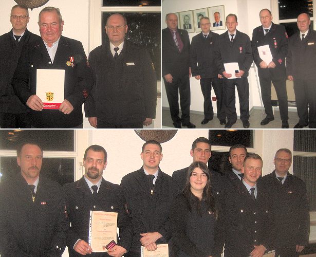Beförderungen und Ehrungen standen im Mittelpunkt Oben links: Ehrenzeichen: v.l. Gemeindebrandinspektor Uwe Volk, Helmut Georg Ihrig, stellv. Kreisbrandinspektor Gerd Beller. Oben rechts: Brandschutzehrenzeichen: