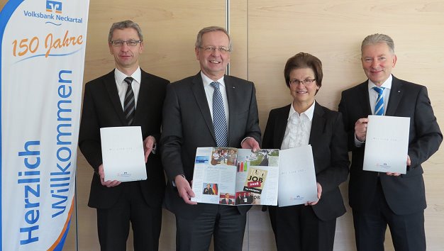 Vom Vorschussverein zur regionalen Großbank V.l. Ralf Gallion, Ekkehard Saueressig, Ulrike Winterbauer und Günter Apeltauer mit der druckfrischen Volksbank-Chronik. (Foto: Claudia Richter)(cr) Genau heute vor 150 Jahren wurde der Grundstein für die jetzt als Volksbank Neckartal bekannte Genossenschaft gelegt. Aus diesem Grund wird in diesem Jahr das große Jubiläum in der Region mit Mitgliedern und Kunden gefeiert. Dieser Tage wurde eine gedruckte Chronik zur Volksbank vorgestellt.