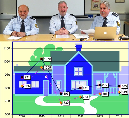 Straftaten auf vergleichsweise niedrigem Niveau Das Diagramm zeigt den Sechs-Jahres-Verlauf der bei der Eberbacher Polizei registrierten Straftaten (obere Kurve). Die untere Kurve gilt für Eberbach (ohne Schönbrunn und Heddesbach). (Foto: Claudia Richter)(cr) Das Polizeirevier Eberbach präsentierte dieser Tage wieder seine jährliche Kriminalstatistik. Revierleiter Erich Lindenthal, Jugendsachbearbeiter Bernd Grimm und der stellvertretende Revierleiter Gerd Lipponer (Bild v.l.) erläuterten die Entwicklung der Straftaten im Jahr 2014.