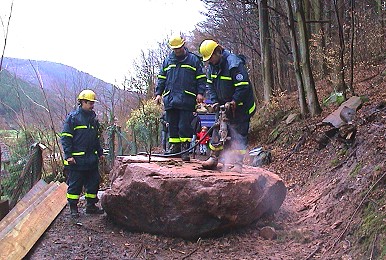 THW macht den Weg frei Alexander Knörzer (links) und Matthias Hodbod (Mitte) zerlegten mit ihren THW-Helfern den Felsblock fachmännisch. (Foto:Richter)