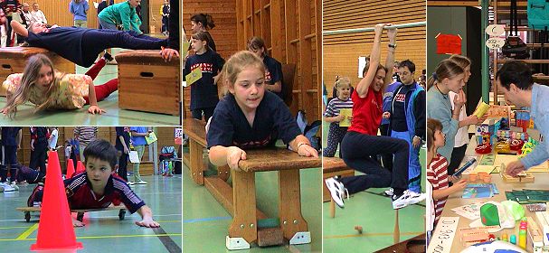 Wer ist fit wie ein Turnschuh? (Fotos:Richter)(hr) Kids zwischen sieben und zwölf Jahren lud der Turnverein heute zu einem Fitnesstest in die Mehrzweckhalle der Dr.Weiß-Schule ein. Gut 120 Mädchen und Jungs traten an, um zu beweisen, dass sie "fit wie ein Turnschuh" sind. So lautet nämlich das Motto der Veranstaltung, die zentral vom Deutschen Turner-Bund ausgeschrieben wird und die der TV Eberbach nun zum dritten Mal im Abstand von jeweils zwei Jahren durchführte. An zahlreichen Stationen waren Übungen aus verschiedenen Bereichen wie Bauch, Rücken, Beine, Arme, Körperspannung, Schnelligkeit und Geschicklichkeit zu absolvieren. Stationen wie "Fliesenslalom", "Knallball", "Kriechtunnel", "Bergsteiger" oder "Hängebrücke" zeugten vom Einfallsreichturm der Organisatoren. Am Schluss durfte jeder erfolgreiche Teilnehmer ein Los ziehen und einen der Preise mit nach Hause nehmen, die von verschiedenen Eberbacher Unternehmen gespendet wurden.