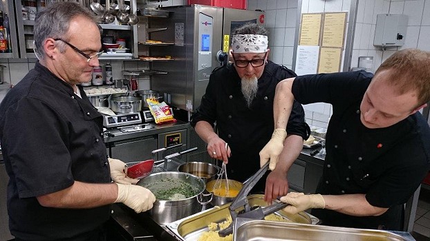 Diesen Eindruck hat auch Michael Trost mitgenommen. „Der Stefan ist ein völlig unkomplizierter Typ“, sagt er. Schon nach kurzer Zeit „denkst du, den kennst du schon seit 20 Jahren“. Die Chemie stimme sofort. Dazu trägt auch bei, dass sich der Fernsehkoch für keine Arbeit und keinen Spaß zu Schade ist. „Ein absoluter Profi, der das aber nicht raushängen lässt“, sagt Trost. Denn Marquard räumt die gespülten Teller wieder in die Schränke ein, schält die Zwiebeln, schwenkt den Topf, sortiert das Geschirr für den nächsten Gang zurecht. Er rattert die Zutaten für die einzelnen Gerichte runter, als wär es das Einfachste der Welt. Ein Team-Mitglied, das kein Restaurant-Chef gerne wieder ziehen lassen möchte.