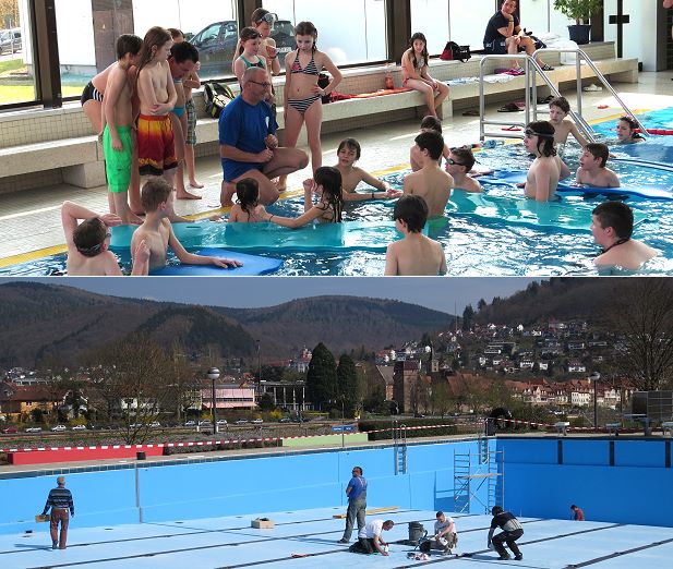 Während die Badegäste den Nachmittag im Hallenbad genossen, liefen im Freibad so genannte “Auswinterungsarbeiten”. Mitarbeiterinnen des Bäderteams und Handwerker sind damit beschäftigt, das Schwimmbecken, die komplette Anlage und das Gelände auf Vordermann zu bringen. Stadtwerkeleiter Günter Haag geht beim jetzigen Stand davon aus, dass das Freibad Mitte Mai seine Tore öffnen wird. Den genauen Termin werden wir im EBERBACH-CHANNEL zeitnah veröffentlichen. Der Kartenvorverkauf für ermäßigte Freibad-Saisonkarten beginnt am 13. April.