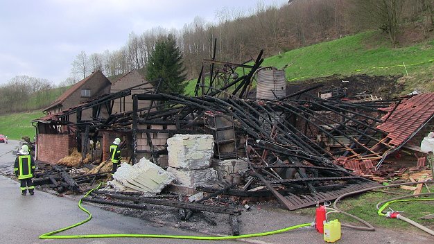 Gegen 3 Uhr war in einer Scheune an der Ortsdurchfahrt in Unter-Sensbach ein Feuer entstanden. Eine Passantin bemerkte den Brand und veranlasste die Alarmierung der Rettungskräfte. Als die ersten Helfer der Freiwilligen Feuerwehr Sensbachtal am Brandort eintrafen, stand die große Scheune bereits lichterloh in Flammen. Das Feuer drohte auf das direkt angrenzende Wohnhaus des landwirtschaftlichen Betriebs überzugreifen. Gemeinsam mit der hinzu alarmierten Feuerwehr Beerfelden konnten die Sensbachtaler in stundenlangem Einsatz Schaden vom Wohngebäude abwenden. Die Scheune war allerdings nicht mehr zu retten.