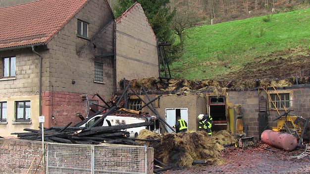 Durch den Eigentümer konnte gleich nach Feststellen des Brandes mit einem Traktor das Scheunentor eingerissen werden, so dass viele der in der Scheune befindlichen Kühe, Kälber und Schweine vor den Flammen flüchten konnten. Dennoch kamen ein Rind und drei Hausschweine bei dem Brand zu Tode. Auch ein Kleinbus, ein Traktor und verschiedene landwirtschaftliche Geräte sowie gelagertes Material wurden zerstört. Únd dennoch: Nachdem der Brand weitgehend gelöscht war, konnten noch zwei Schweine lebend gerettet werden.
