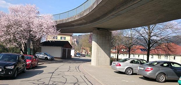 Bahnhofstraße wird teilweise zur Einbahnstraße Bei der Brückenunterführung ist in Zukunft Schluss: Ab 21. April wird die Bahnhofstraße im vorderen Bereich, von der Innenstadt her kommend zum Bahnhofsgebäude, zur Einbahnstraße. Die Parkplätze sind nach wie vor aus beiden Richtungen zu erreichen. (Foto: Thomas Wilken)(tom) Die Hirschhorner Bahnhofstraße wird im vorderen, innenstadtnahen Bereich zur Einbahnstraße: Wie die Stadtverwaltung mitteilt, soll die Anordnung am Dienstag, 21. April, in Kraft treten und vorerst für ein halbes Jahr gelten.