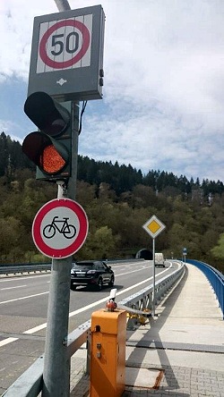 Blinken der Ampeln hat keine Bedeutung für den Autofahrer (Foto: Thomas Wilken)(tom) Nachdem bereits Ende Dezember/Anfang Januar längere Zeit die Warnampeln an Hirschhorner Neckarbrücke und B37-Tunnel in den Blinkmodus übergangenen waren, senden sie seit Sonntagabend wieder Leuchtzeichen. Grund ist laut Hessen Mobil ein Fehler im System bzw. in der Tunneltechnik. Dieser sorge dafür, dass automatisch die Ampeln anspringen, und das Tempo auf 50 gedrosselt wird, erläutert Jochen Vogel, der Sprecher der hessischen Straßenverkehrsbehörde.