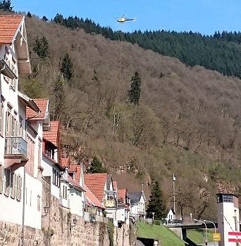 Bäume oberhalb der Bahnlinie per Hubschrauber entfernt (Foto: Thomas Wilken)(tom) Den ganzen Tag über richteten sich gestern die Augen der Hirschhorner nach oben. Denn ständiges Hubschrauberbrummen beeinträchtigte die Unterhaltung auf der Straße je nach Windrichtung massiv. Die Deutsche Bahn führte per Helikoptereinsatz in Abstimmung mit Hessen Forst eine Verkehrssicherungsmaßnahme unmittelbar am Stöckbergweg durch. Zwischen Schloss und Feuerberg, unweit der Freileitungstrasse, wurden nicht mehr verkehrssichere Bäume oberhalb der Neckartallinie Heidelberg-Heilbronn beseitigt.
